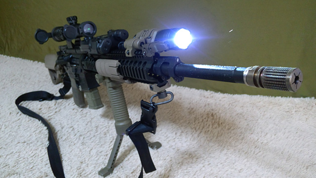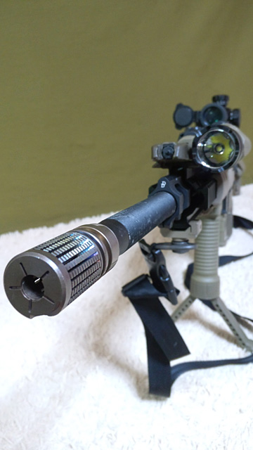 バラバラのパーツから全て組み立てました。20”アウターバレルに14”インナーバレルを装備。インナーは真☆参式滑空銃身を使用しています。スリックパッキンに電気なまず中辛と同軸式チャンバーで面ホップを実現。ver.2、8mmベアリングの強化メカボと14:1ギアにHS50000-Lモーター、ストックチューブ内にFETを搭載しています。ピストンはかなり重量のあるものを使っています。シリンダはフルサイズ、エアロシリンダヘッドのノズルはエポキシパテで整流/流速チューンを実施。配線はフロント出しで、ガスチューブ内を通してます。バッテリーケース内に平型ミニヒューズを内蔵。ガスチューブはステンレスパイプを切り出して作りました。スリングも自作して、バックルとスナップシャックルを採用しQD式で、2点と1点保持に変更可能です。その他外装を箇条書きすると、ハイダーは05ナイツ、ストックはクレーンタイプ、グリップはERGO、ハンドガードはLarue 12”、メタルフレーム、ストックポディションプリントがあるストックパイプ、ハンドガード前端下部にD&D QDスイベルマウント、D&Dのガスブロック、左右切り替え式ライトマウント、ライトnovelarms スティングレイ、スコープnovelarms tac one、スリングストックリング、AN/PEC16バッテリーケース、バトラーキャップ内に防弾アクリル、グリポッド。