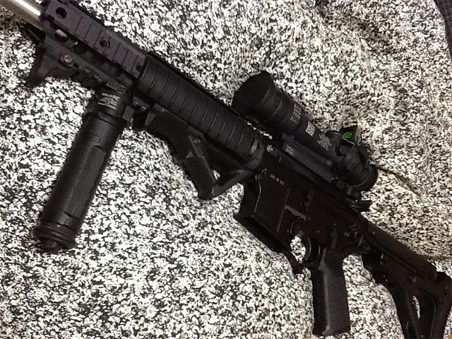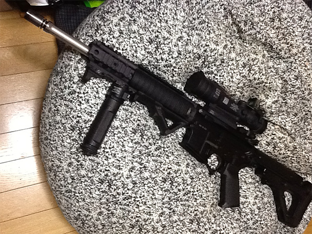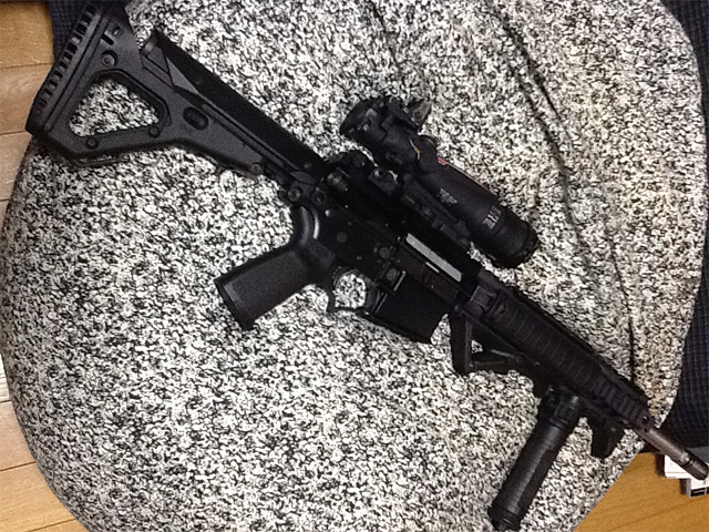 ロングレンジからCQBまでカバー出来る、オールラウンダーなライフルを目指して組み上げてみました。CQBとスナイピングの双方にギリギリ対応という事で、14・5インチバレルをチョイス。ナイツE3ベースの民生カスタムという妄想設定なので、フレームはE3 レールはURX。そのまま行けばストックはクレーンタイプですが、狙撃対応でUBRをチョイスしました。サイトは秘蔵のトリジコン。子ガメダットサイトで、近接戦闘にも即応出来ます。あくまで妄想です。民生カスタムなのに14・5インチはおかしくね?などのツッコミはナシの方向でお願いします。