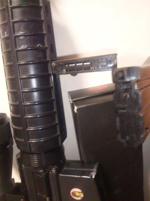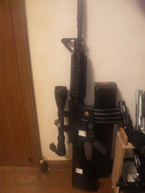 マルイのエアコキXM177e2に同社エアコキのm16のストックを付け、キャリングハンドルを切り取ってM4のトップレイルを装着しました。写真ではスコープですが、LMTタイプリアサイトを付ける事で、ノーマルスタイルになり、ドットサイトを付ける事で、近距離戦に対応させることもできます。レイルひとつあるだけでかなり拡張性が広がることを思わせるカスタムです。