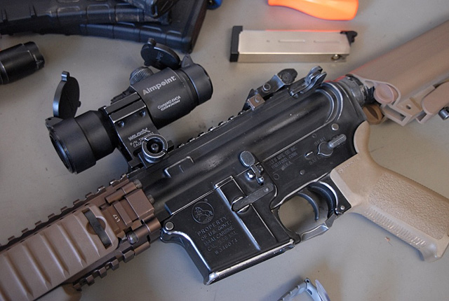 ドットサイトはAimpoint COMP M2とWilcoxマウントの組み合わせで、レンズの保護と光の反射を抑えるキルフラッシュを入れてあります。