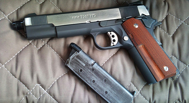 マルイのミリガバベースで作りました。フロントセレーションはジャンクのミリガバセレーション部分を切り取って移植し、セーフティー、スライドストップ、ハンマーなどは、ハイキャパのパーツを加工しました。