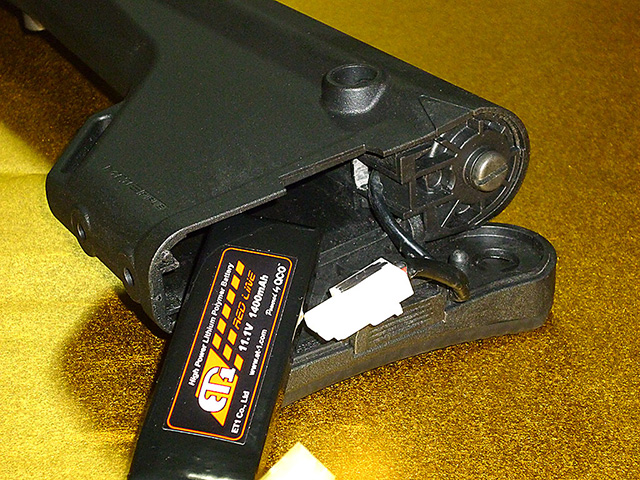 スイッチデバイスはバッファチューブの中を通して、バッテリーをストック内に収納できるように加工。