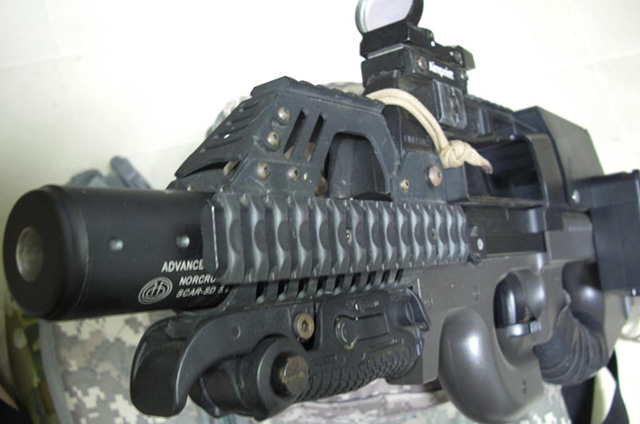 コンパクトなイメージがあるP90ちゃんですが、レイルハンドガードを取り付け一見長物にし更にインナーバレルをM4のものと交換し中身も長物同様にし、そして更にボックスマガジンを取り付け「大きく」を再現しました。