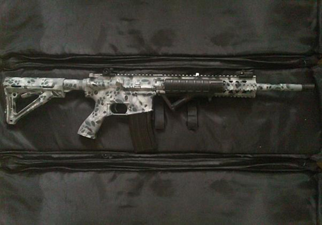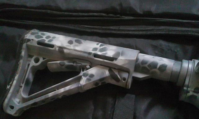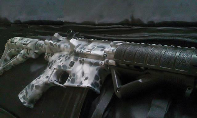 ■投稿タイトル:CM16R8 都市迷彩 ■投稿者: うんも ■コメント G&G CM16R8を都市迷彩系に仕上げました。 森で使用したのですが、かなり目立ちます:(;゛゜'ω゜'):