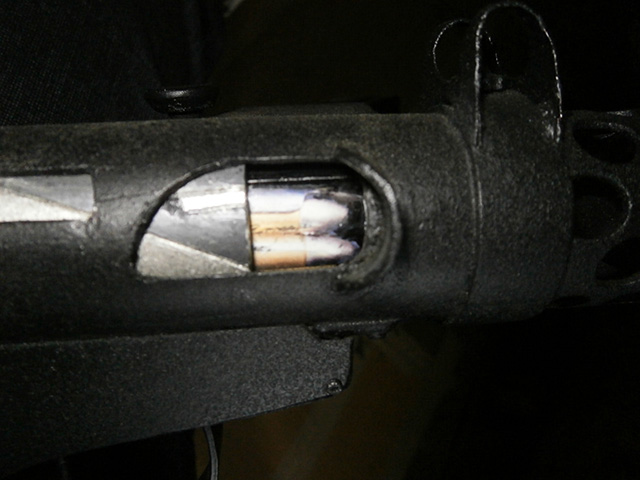 コッキングノブは、約60mmストロークです、最後の20mmが、ボルト連動で、ハイキョウ窓から9ミリカートが顔を覗かせます、写真のカートですが、それだけでもリアルです。