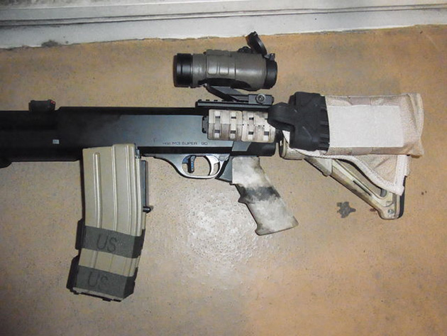 専用で販売されているマウントは使いづらいのでライラクスから出ているM870・M3のミニレイルに取り付けられるマルチレイルの90mmを、両脇には55mmのを取り付け。