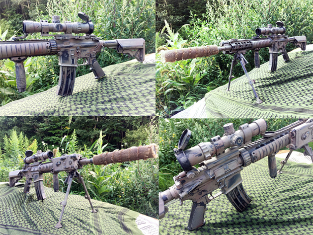 そのままでも十分にリアリティーのあるガスブローバックライフルですが、さらにリアリティーを追及すべく、光学機器やアクセサリーをプラスし、何度も塗装及び加工を施し仕上げた自信作です!!
