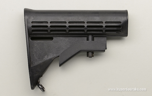 米コルト社製のコラプシブル(伸縮)ストック。リトラクタブルストックとも呼ばれる。軍に納品される6ポジションのM4カービンに標準装備される最もベーシックなスタイルのストック。旧タイプの伸縮ストックから発展したストックで、強化樹脂の素材変更のほか、両サイドに強化用のリブが付くなど形状も大きく変わった。