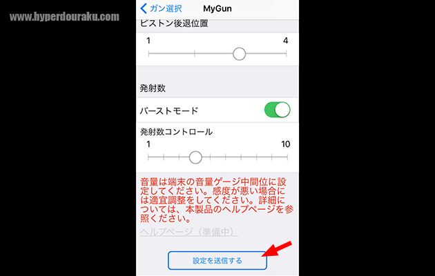 ガンに接続して各種設定をアプリで行った後は、画面をスクロールして、最後に設定を送信するを押せば、銃本体内の電子基板上に設定が保存されます。