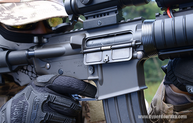 まず、ピストン後退位置でのトリガーレスポンスを試してみました。トリガーの感触ですが、ノーマル電動ガンの“モシャバン!”というギア、ピストンのメカノイズもなく、トリガーを引いた瞬間に“バシッ!”と発射され、確実にレスポンスの向上が実感できます。セミオートでの速射にもちゃんと追従して問題ありません。試しトリガー前に指を入れて素早く前後に動かしてみましたが、トリガーロックすることなく全弾確実に作動します。レスポンス、追従性は文句なしです。