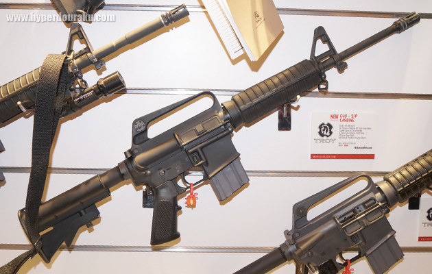 ラスベガスで開催されたSHOT SHOW 2017の米銃器メーカーTroyブースにて展示されていた、XM177E2(上)と、GAU-5/A/A(下)。ベトナム戦争期に使われていたM16系のショートカービンなど、実銃の世界でも懐かしいモデルのリメイクが流行っている。