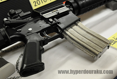 可変ホップアップを搭載しており、ハンドガードを外してバレル基部の下側にダイアルがあるとのことだったが、残念ながら写真は撮らせてもらえなかった。