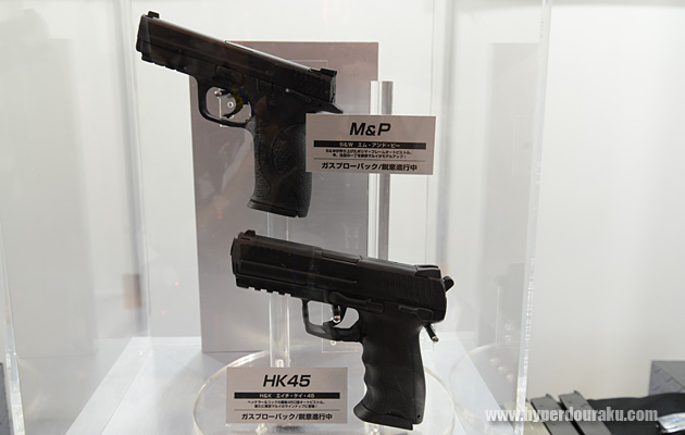 さて、こちらは依然モックアップの状態が続く期待の18歳以上対象のガスブローバックガン、M&PとHK45。とりあえず色が黒くなった。とりあえずM&Pから発売お願いします。