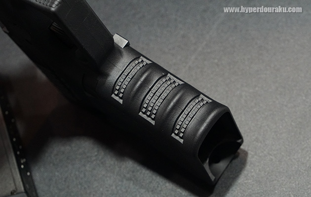 またトリガーガード下の正方形の痕は、軍用データマトリクスがない民間版のグロックの成形痕を再現したものなのだそう。芸が細かい。