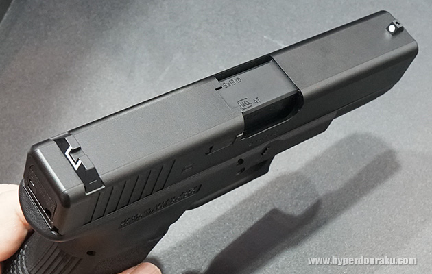 スライドトップ。15mm系の大口径ピストンを採用しているのでリコイルも従来のグロックに比べて大きくなっているそう。ただ、ドットサイトがダイレクトマウントできるM.O.S.に対応はしていない形状のブリーチブロックだそうで、今後M.O.S.対応させるにはDカップピストンか、径を小さくするかなどの作り直しが必要になりそうだ。