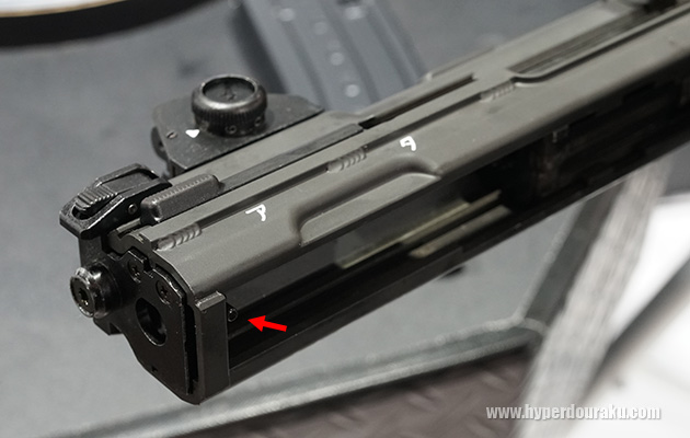 前回のマルイフェスティバル4の展示モデルと大きな変更はないが、リコイルスプリングアッシーがテイクダウン時に飛び出さないよう、矢印の部分にストッパーピンが付いた。