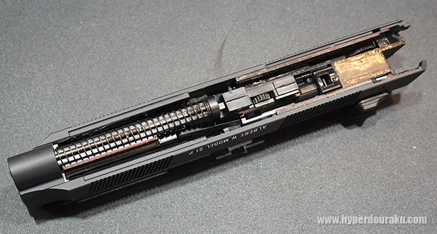 エキストラクターは金属の別パーツ。15mm径の大口径シリンダー採用。ショートリコイルの構造などもユニット的にはUSPなどに近いとのことで、フリクションロスの少ない力強いリコイルが期待できそう。