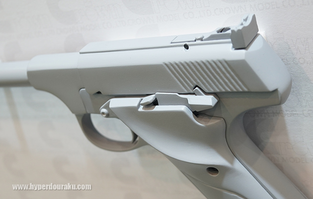 このモデル、SIG AIRのCO2ガスガンが国内ではすでに発売済みで、マルイもリキッドチャージ式のガスブローバックガンを発表済み。そこへクラウンがエアコキで三つ巴の様相。果たしてライセンスの問題はどうなるのか?