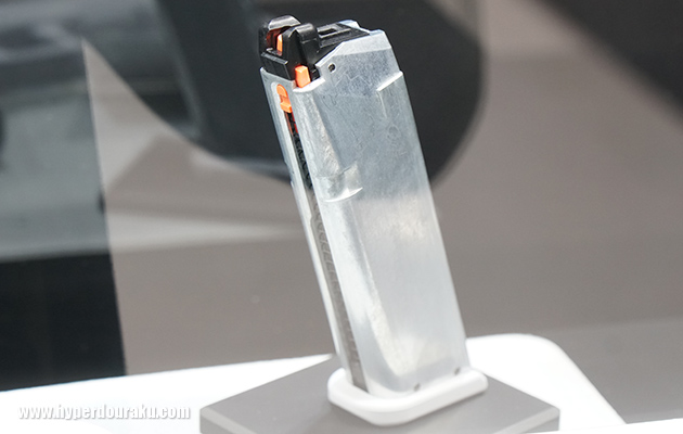 マガジンはバージョン2.0に進化。マルフェス動画でも語られているが、気化効率アップ、フォロアーカラーがオレンジになっている。サイズ互換性があり、従来のマルイのグロックガスガンシリーズにも使用できる。