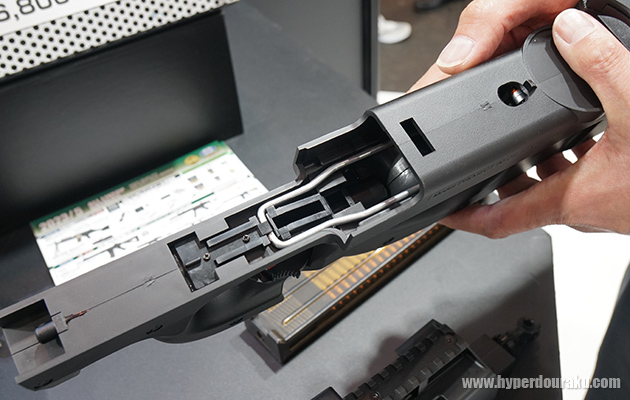 MOS化したことでシリンダーが異形シリンダーとなったそうだ。D型でもなく、いろいろな形を検討したが、まだどんな形状なのかは秘密なのだそう。例えば四角シリンダーとか、小口径ダブルシリンダーとか、マルイのロゴ形状のひょうたんシリンダーとか、とにかくいろいろ研究したようだ。
