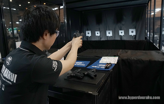 G17のマガジンも使える。なお、スライドにはGLOCKのマークは入るが、展示では正式ライセンスということは謳っておらず、スタッフにライセンスのことを聞いても取得しているような話は聞けなかった。世界的にはGLOCKのエアソフトライセンスはUMAREXが管理しているのだが、日本国内のみの販売前提で折り合いが付いているのかも。