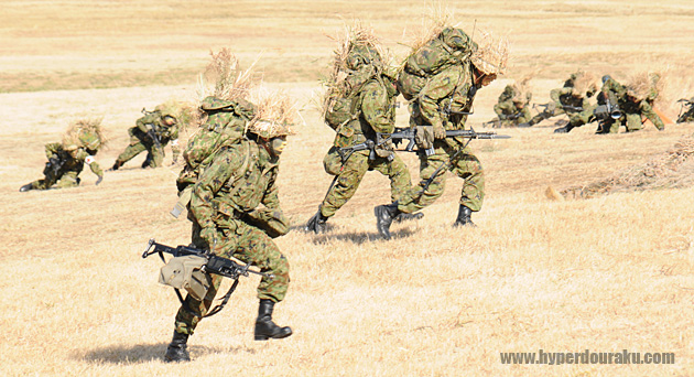 稜線際では姿勢を低くし、先行してしたスナイパーチームと合流、89式小銃折り曲げ銃床式や5.56mm機関銃MINIMIなどで敵を迎え撃つ。