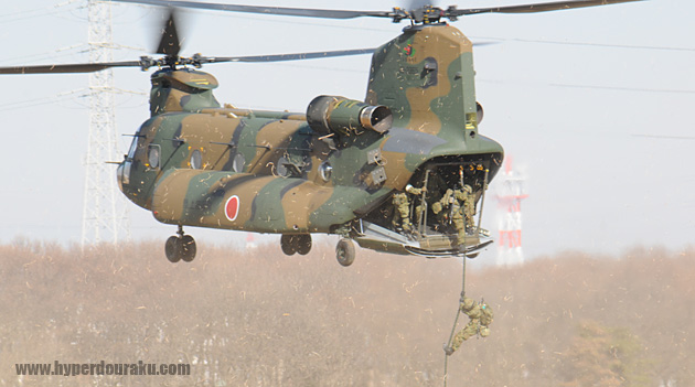 指揮官が上空のCH-47Jチヌーク輸送ヘリコプターからジャンプ!!