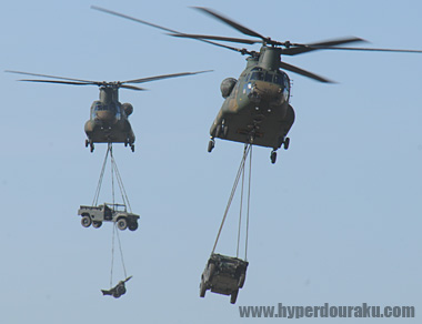 さらにCH-47で軽装甲機動車、高機動車、120mm迫撃砲 RTを吊るして運んでくる。