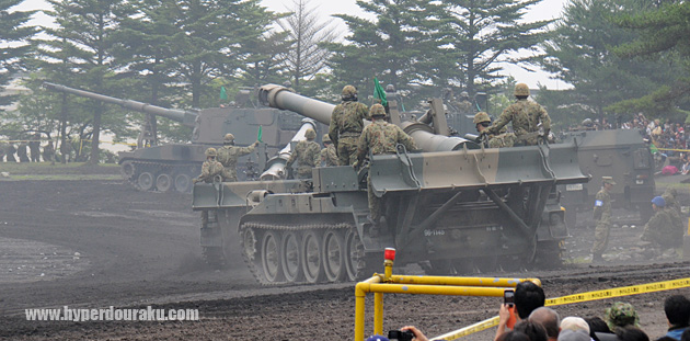 グランド右手には特科部隊の99式自走155mmりゅう弾砲、FH70、203mm自走りゅう弾砲が進入してくる。