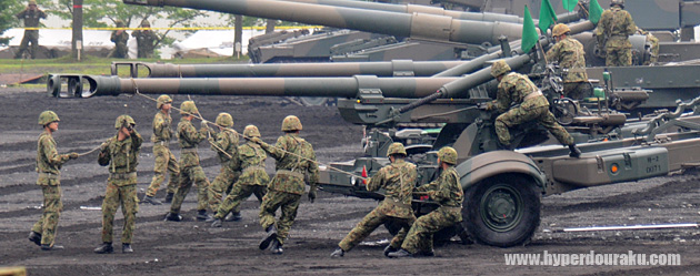 射撃体勢を整える155mmりゅう弾砲 FH70。結構大人数で準備している。