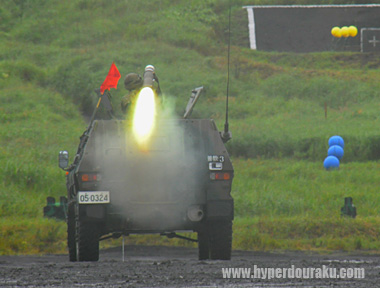 軽装甲機動車のルーフから01式軽対戦車誘導弾(軽MAT)を射撃。