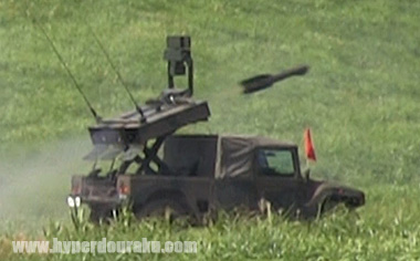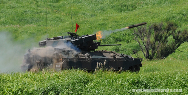 89式装甲戦闘車の79式対舟艇対戦車誘導弾発射装置、通称「重MAT」の射撃。これは赤外線による有線誘導方式。