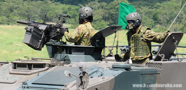 この96式40mm自動てき弾銃は車内から射撃することもできる。機甲科用ヘルメットと無線機、防弾チョッキ2型を装備した車長がカッコイイ!!