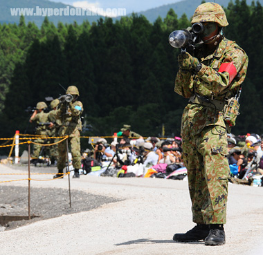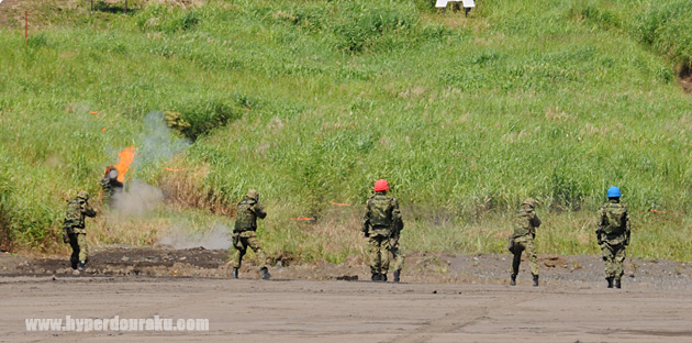 その後96式装輪装甲車から隊員が展開、下車戦闘を行う。89式小銃および5.56mm機関銃 MINIMIにて二と型ターゲットを撃つ。曳光弾が着弾するとターゲットは激しく燃え上がる。