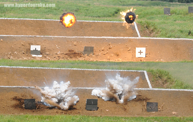 84mm無反動砲から発射された対人用榴弾の空中爆発(上)と、発煙弾の着弾シーン。