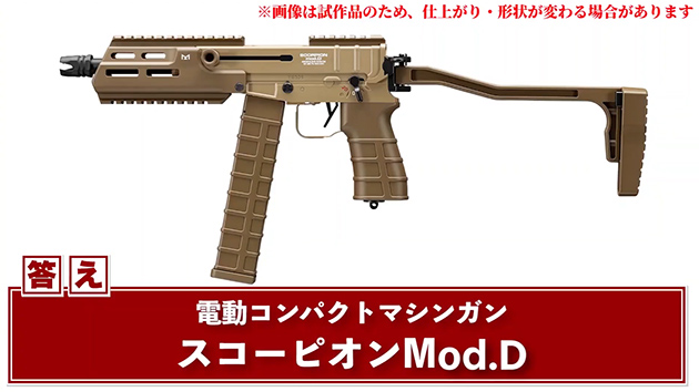 2枚目の答えは電動コンパクトマシンガンのスコーピオンMod.D。Dはデザートを意味する。スコーピオンMod.MのデザートカラーバージョンでFDEカラーのパーツ構成になっている。フラッシュハイダーはチラ出しにもあったアルミ切削のショートな4プロングタイプでMod.Dオリジナルパーツだ。
