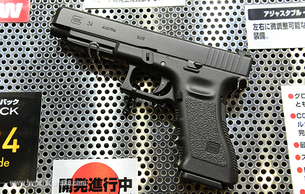 グロック34。ガスブローバックガン。今回初めてのお披露目。ロングスライドを装備した9mmのコンペティションモデル。全長222mm、重量710g、装弾数は25発。