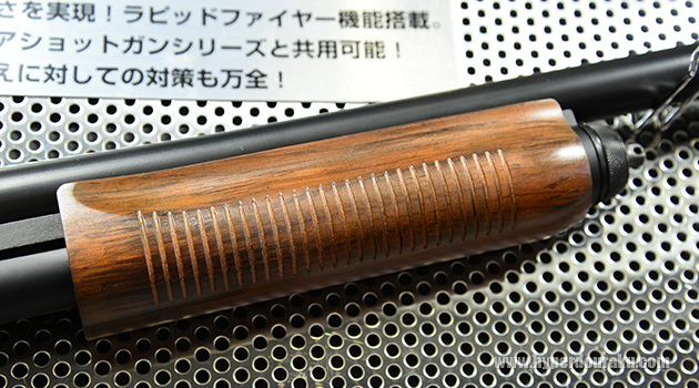 フォアエンドもウッド調のプラ製ではあるが、近くでまじまじと見ないとわからないくらいにリアルだ。