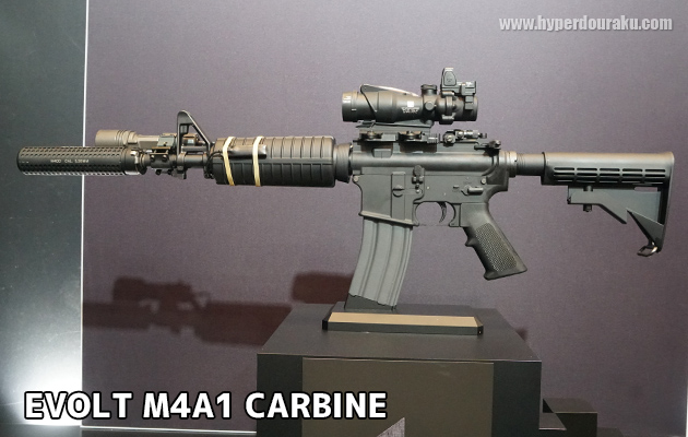 まずは、今回のマルフェスの目玉とも言うべき、新シリーズ。電動ガンEVOLTシリーズの第一弾 M4A1カービンと第二弾 EVOLT RSのFPR Mk Ⅳ。※光学照準器やサイレンサーは参考カスタム。