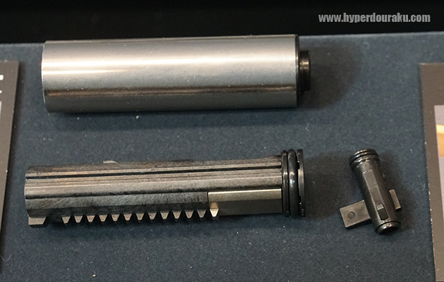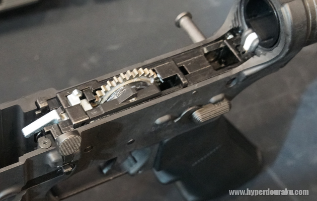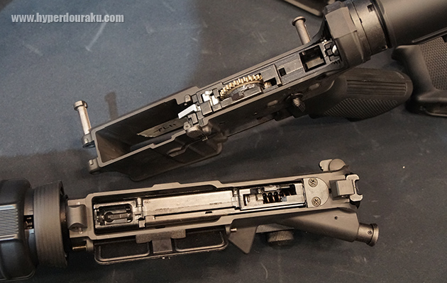 また、実銃同様にテイクダウンピン、ピボットピンを抜いて、上下レシーバーを簡単に分割できる。アッパーレシーバーにはピストン&シリンダーやチャンバーアッシーが、ロアレシーバーにはギアボックスが収まっている。そしてなんと、今後はアッパーのみ、ロアーのみの販売もされる予定とのことだ。
