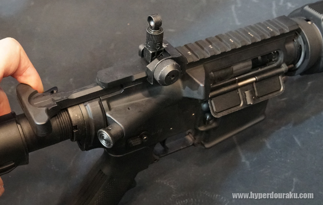 チャージングハンドルを引くか、ホールドオープンするとダミーボルトが写真の位置まで後退して停止する。可変ホップアップダイヤルは従来の位置にある。射撃時にはダミーボルトが前後し、電子制御されているので、中途半端な位置で止まってしまうこともなかった。