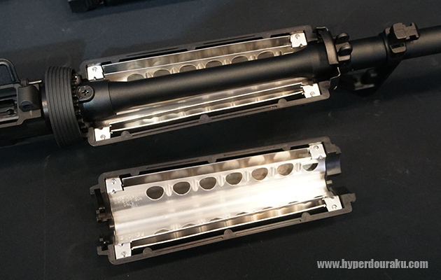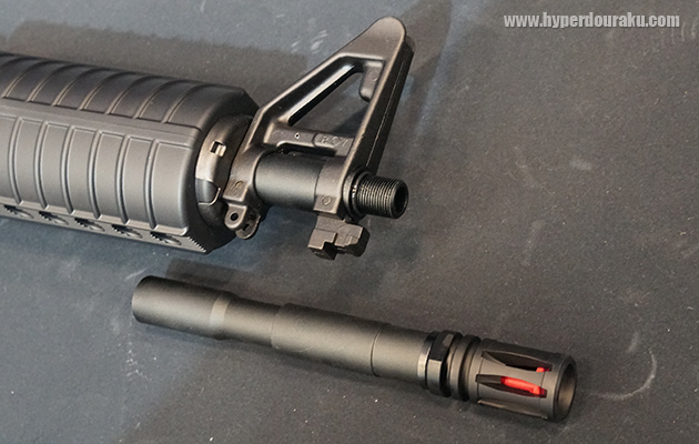 アウターバレルはM4A1カービンは14.5インチだが、フロントサイト直前で分割式となっており、付属のパーツで11.5インチ仕様にもできるバレルチェンジシステム。アルミ削り出し製のフラッシュハイダーも含め、ネジ規格はM14逆ネジ仕様。