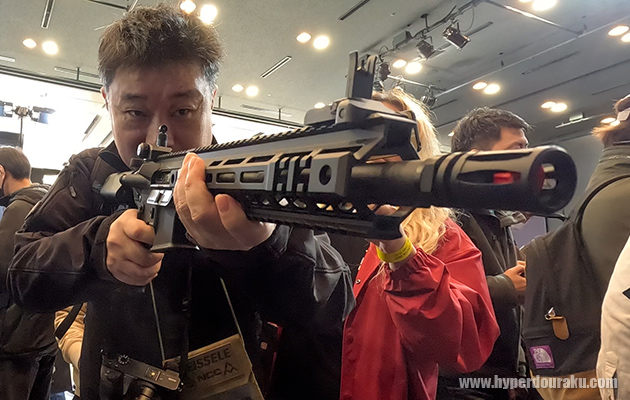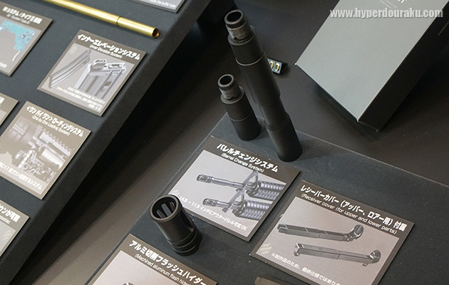 レシーバーはアルミダイキャスト製で無刻印。セラコート仕上げとなっている。色んなスタイルの人がいるので、という話だった。自分の好みの刻印を後から入れられるというのも面白い試みだし、ライセンス料も必要なしという合理的な考え。