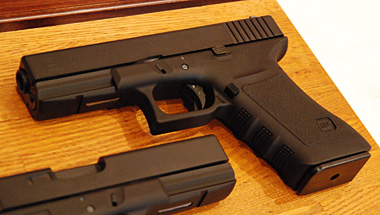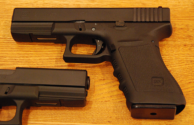 グロック21の実銃は.45ACPを使用し、スライドやフレームの厚みも9mm版のグロック17などと比べると大きい。