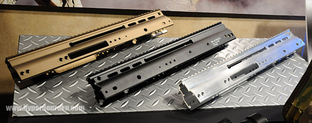 実際に商品を持ってみた感想は、非常に剛性は高く、重からず、軽からず、と言ったところ。バッテリーが入っていなかったので、装着すると3.5kgとやや重たくなるか。これに光学機器をこてこてと付けていくと4kgに近づいていく。G36のようにもっとポッテリした感じかと思ったが、意外にシャープな印象でアルミフレームの剛性とあいまって、意外と重くは感じなかった。しっかし、コレは買っちゃうなぁ...。