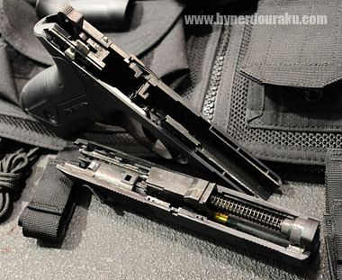 スライドを分解。トリガーガード前方のテイクダウンラッチでグロックのように簡単にスライドが抜ける。