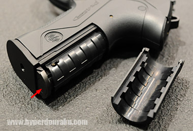 実際に射撃すると実銃同様に、この部分が前後に可動するとのことだった。