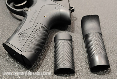 ローテティングバレルロッキングを再現、グリップ後部のバックストラップを交換可能。ノーマルアーチ、ストレート、ラージアーチの3種が標準で同梱される。交換はピンを抜くことなく、底部のスイッチで取り外し可能。