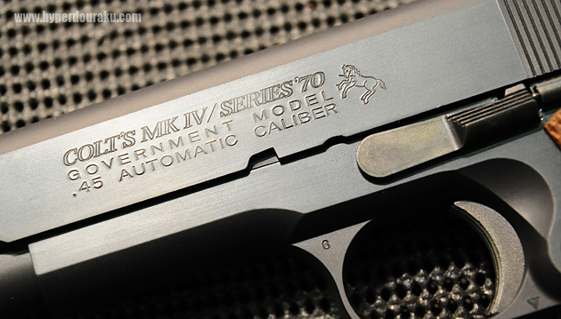 コルトゴールドメダリオン入り木目調のグリップはブラスト仕上げで質感もリアル。グリップパネル内側にはウエイトが入る。スライドストップもサムセフティも新規形状パーツで構成される。