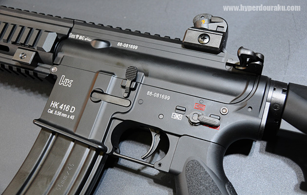 HK416Dと言えば米デルタフォースや自衛隊の特殊部隊なども採用するという噂の最新M4クローン。HK416のもっとも大きな改良点としては、M4カービンのガス作動方式であるリュングマン方式から、ショートストロークピストン方式へと変更し作動性を向上させたこと。